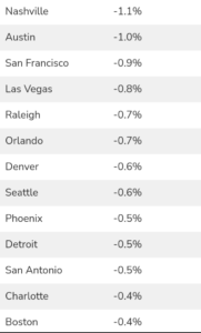 و من حيث النسب المئوية تصدرت ناشفيل جميع المدن الكبرى بانخفاض %-1.1، تليها أوستن و سان فرانسيسكو :